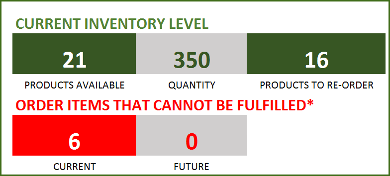 Products Available: Number of Products where the current inventory level is greater than 0.